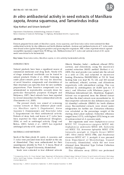 Pdf In Vitro Antibacterial Activity In Seed Extracts Of Manilkara Zapota Anona Squamosa And Tamarindus Indica Sridhar Seshadri Academia Edu